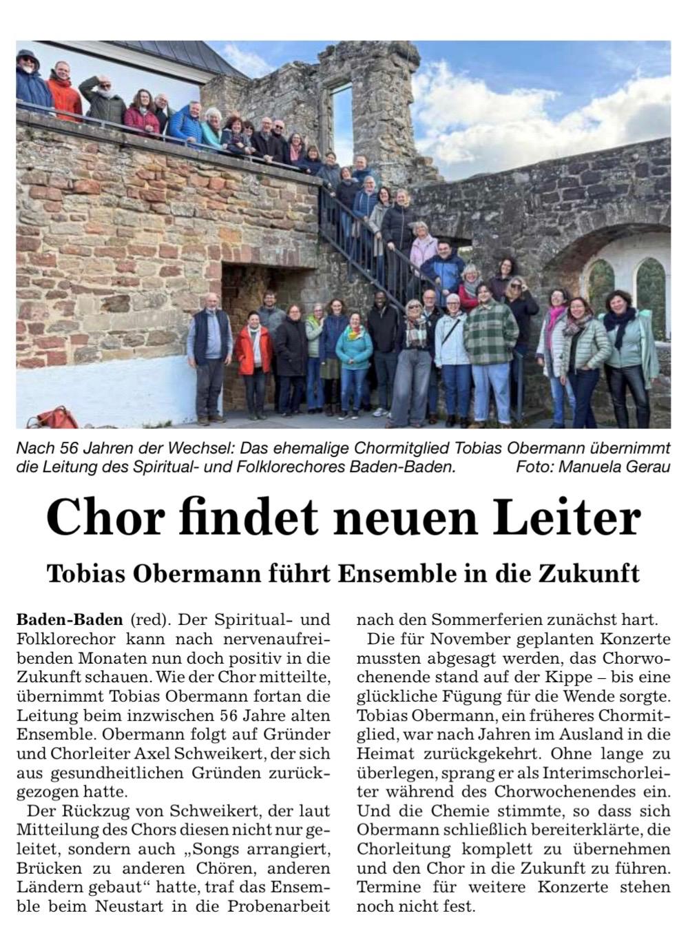 Badische Neueste Nachrichten: „Der Spiritual- und Folklorechor kann nach nervenaufreibenden Monaten nun doch positiv in die Zukunft schauen. Wie der Chor mitteilte, übernimmt Tobias Obermann fortan die Leitung beim inzwischen 56 Jahre alten Ensemble. Obermann folgt auf Gründer und Chorleiter Axel Schweikert, der sich …“ weiterlesen… 18.12.2024